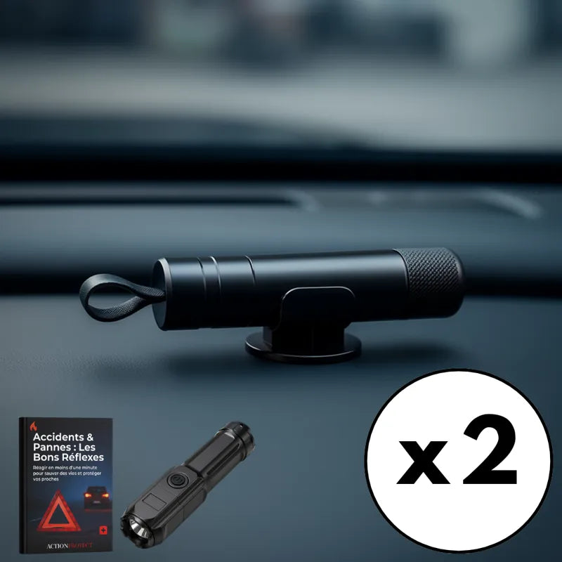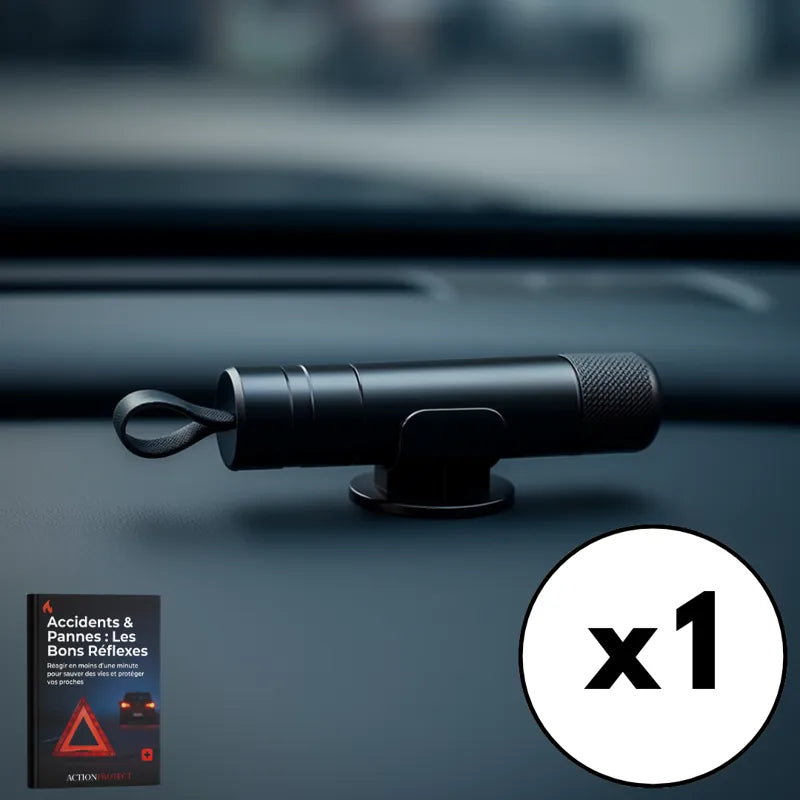 Coupe-ceinture + brise-vitre utilisable en moins de 5 secondes.